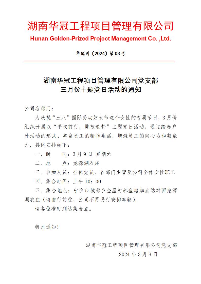 湖南華冠工程項目管理有限公司黨支部三月份主題黨日活動的通知